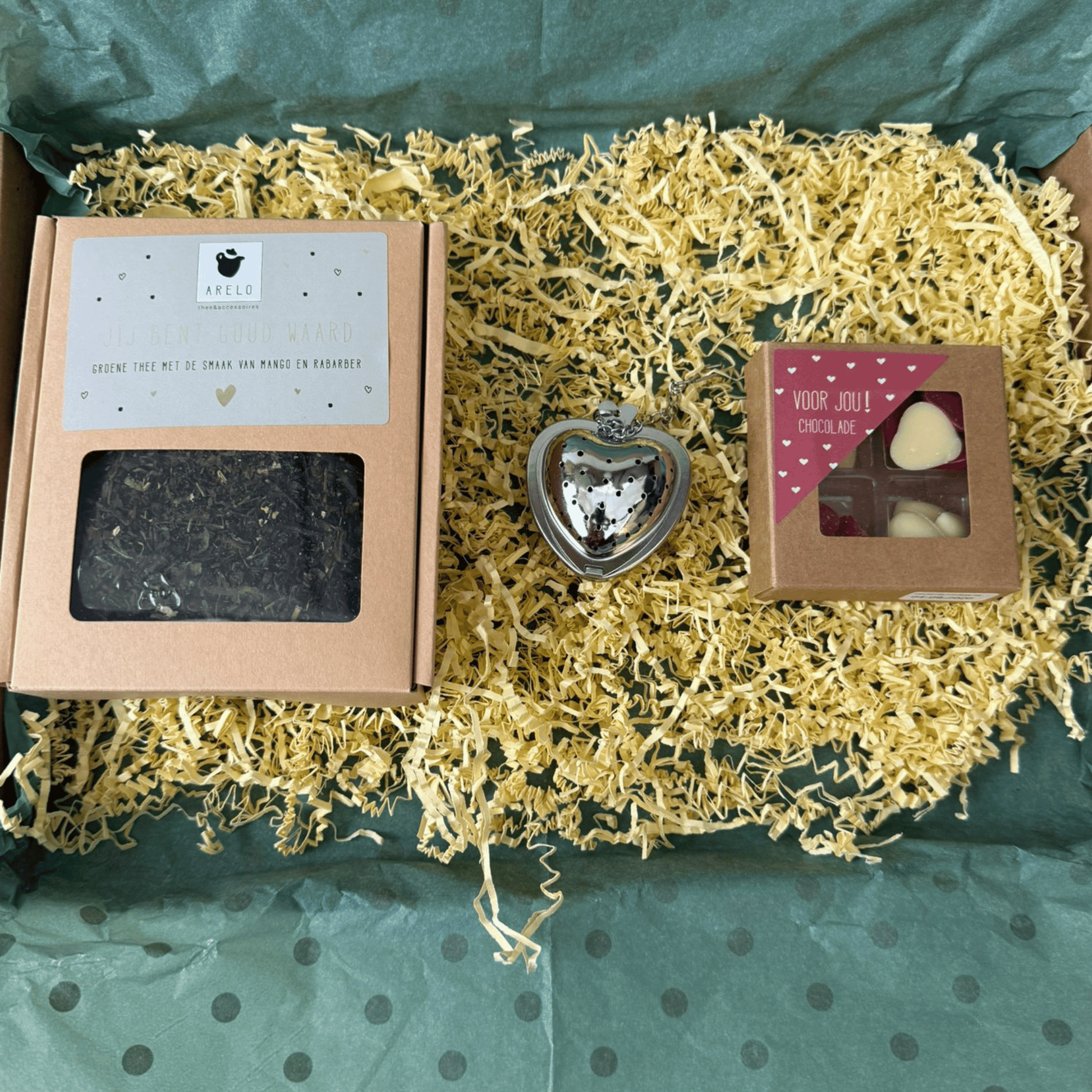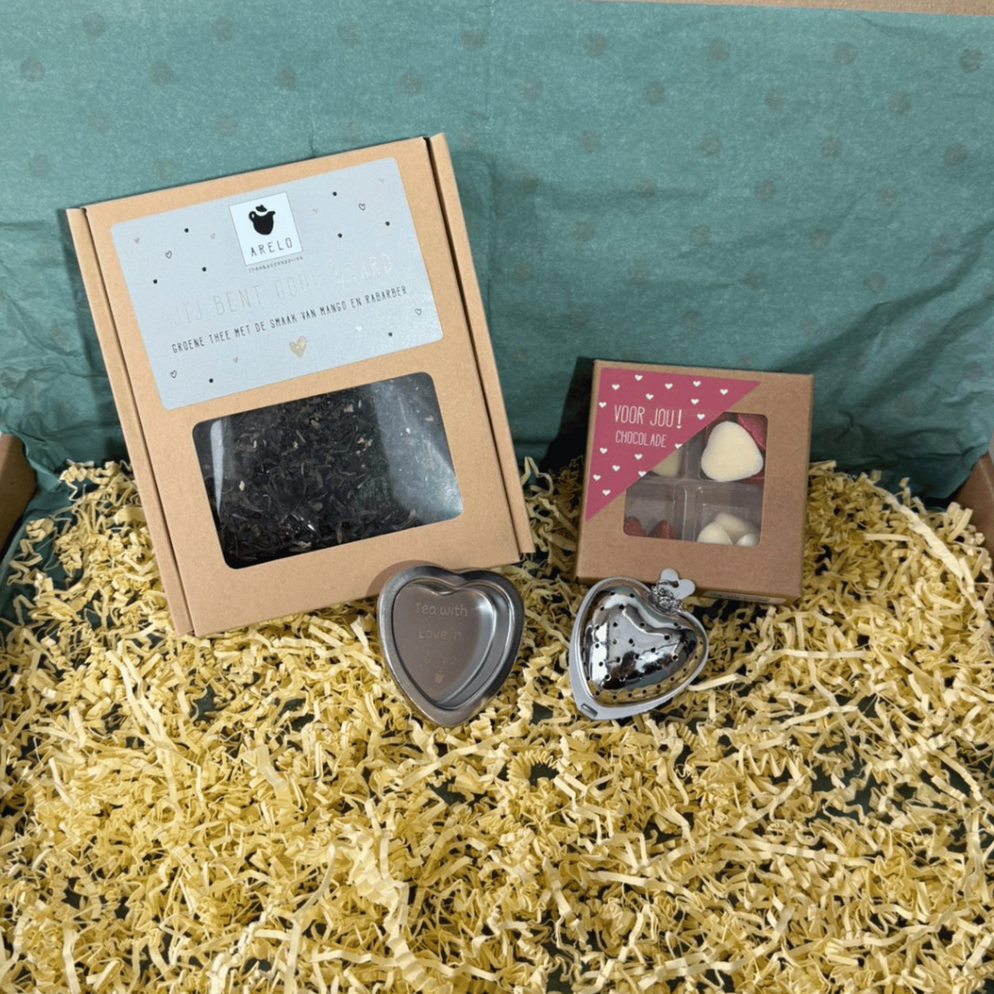 Laat iemand stralen met dit kleine maar bijzondere pakket! 🌟 Groene thee, liefdevolle chocoladehartjes en een schattig hartvormig thee-ei zorgen voor een moment van pure warmte en geluk.