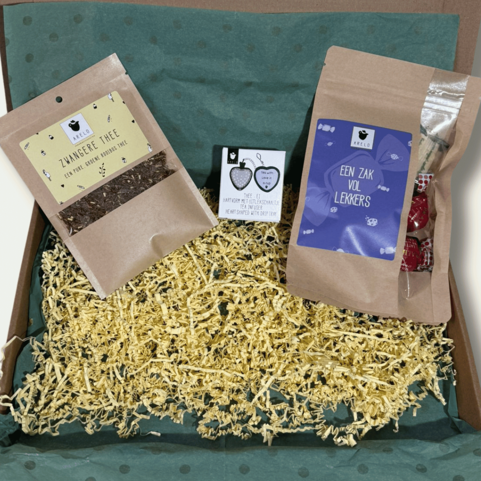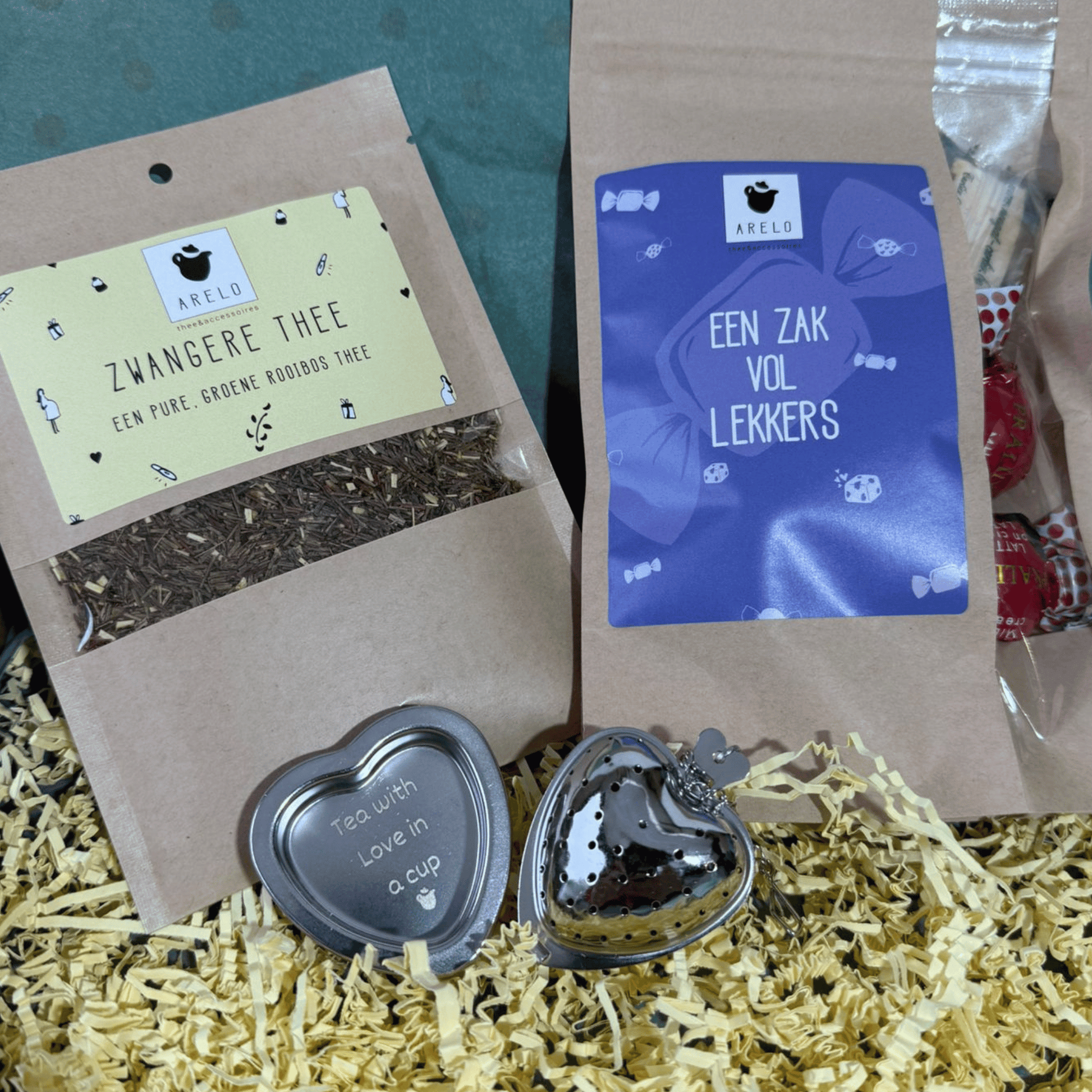 Laat een aanstaande mama genieten van een moment vol rust, warmte en zoete verwennerij. 💖 Rooibos thee, een hartvormig thee-ei en heerlijke lekkernijen maken dit pakket perfect voor ontspanning en geluk.