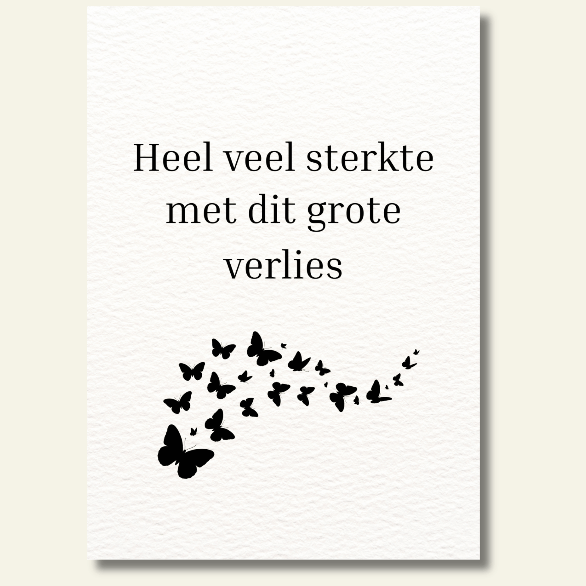 Het kaartje “Heel veel sterkte met dit grote verlies” met zwarte vlinders onder de tekst is een subtiel en warm gebaar van medeleven. Perfect om steun te tonen en iemand een hart onder de riem te steken. Gedrukt op stevig papier en ontworpen door ’t Kleinigheidje.