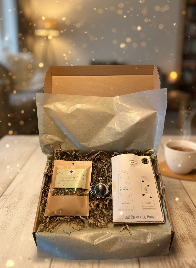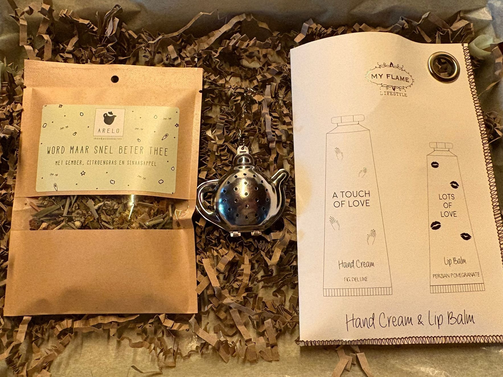 Het RVS thee-ei in de vorm van een schattige theepot maakt het zetten van de thee extra leuk en makkelijk. Voor een extra liefdevolle touch bevat het pakket ook een verwensetje van MyFlame met handcrème en lippenbalsem, vergezeld van de boodschap A touch of love. Zo krijgt je verrassing niet alleen warmte van binnenuit, maar ook een klein momentje van zelfzorg.
