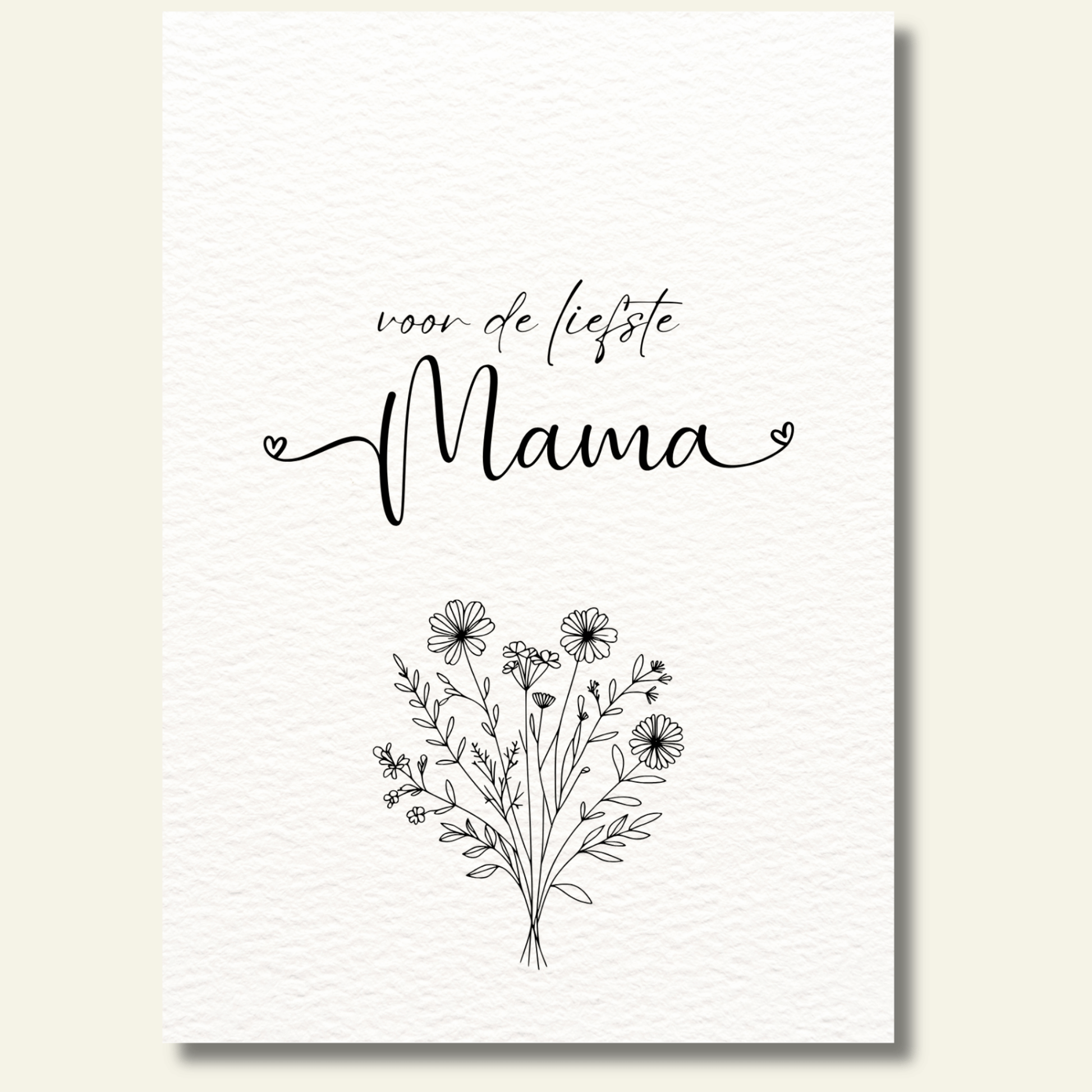 Dit kaartje “Voor de liefste mama” combineert een eenvoudige, oprechte boodschap met een minimalistisch bloemenboeket in zwart. Het ontwerp straalt elegantie en warmte uit, perfect voor Moederdag, haar verjaardag of zomaar, om haar dag op te fleuren.